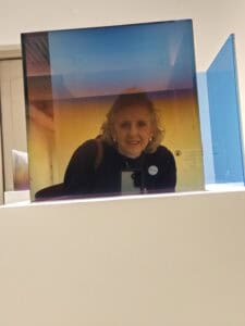 There’s a particular pleasure in seeing Bell’s glass in SAMA’s galleries. The museum’s architecture —brick, steel, and daylight — feels like a collaborator, not a backdrop. In one laminated panel, a mirrored veil blooms into color at an angle. In a cube, interior reflections read like a 3D sketch you can walk around. A step to the left intensifies a fade; a step to the right turns a reflection into an edge. “Art and science” is how SAMA frames it — work that invites you to slow down and engage your surroundings in new ways. It draws you in and adds wonder to your visit.
