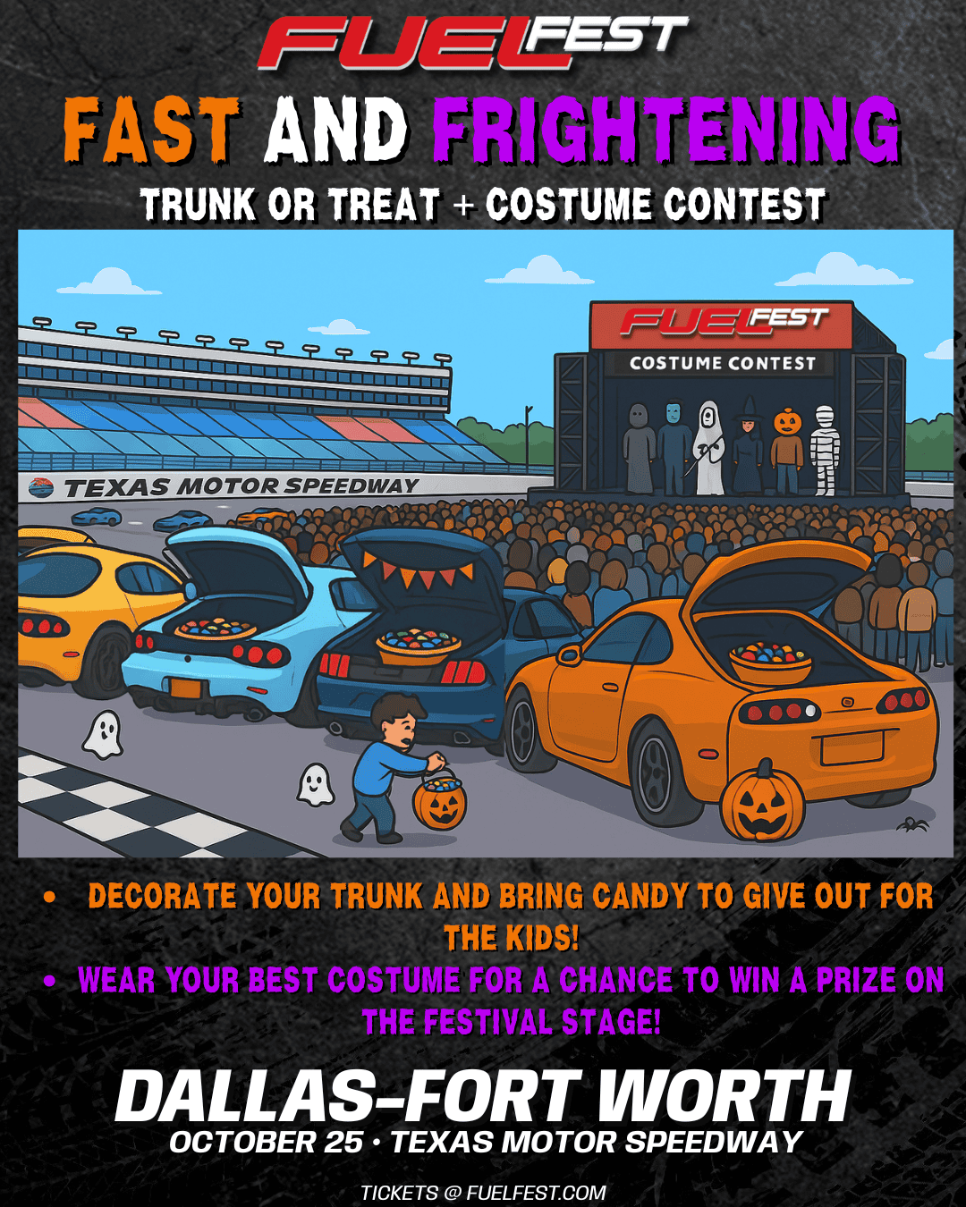 Man, we’re excited to be coming back. This will be our fourth year. We obviously moved far away from last year’s date because we wanted good weather. The thing I love about FuelFest, there’s just a lot of things going on simultaneously at any given moment. Obviously, the drifting. Then, the opportunity to do a ride-along is always a crowd pleasing for sure. People love doing that. We’re also going to have the NASCAR experience going on this year, so people can sign up to drive a NASCAR around the iconic Texas Motor Speedway. We also have some guest pro drivers there as well. Chris Forsberg, Chelsea DeNova, and many others. So that’s going to be really cool. We’ve got Conway the Machine headlining for us on our festival stage. And then of course, our Taste of Tokyo section, which is our more curated section of the show, will be really nice as well.