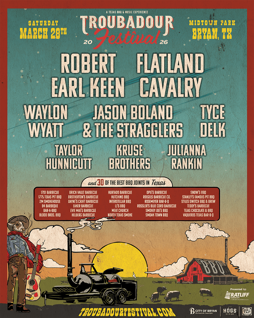 If you are a lover of Texas country music, then be sure to circle March 28th on your calendars for the Troubadour Festival in Bryan, where live music and Texas barbecue come together for one of the more unique spring events on the calendar. The lineup is led by Texas legend Robert Earl Keen and rising Red Dirt favorites Flatland Cavalry, pairing a songwriter who helped define the scene with a band that’s helping carry it forward to a new generation. Between sets, the festival doubles as a food lover’s paradise, giving attendees the chance to sample barbecue from top pitmasters around the state, making it just as much a culinary experience as a concert. With great music, smoky brisket in the air, and an easygoing small-town atmosphere, Troubadour Fest feels like a perfect day trip for Central Texas fans looking to experience a little bit of everything Texas does best.