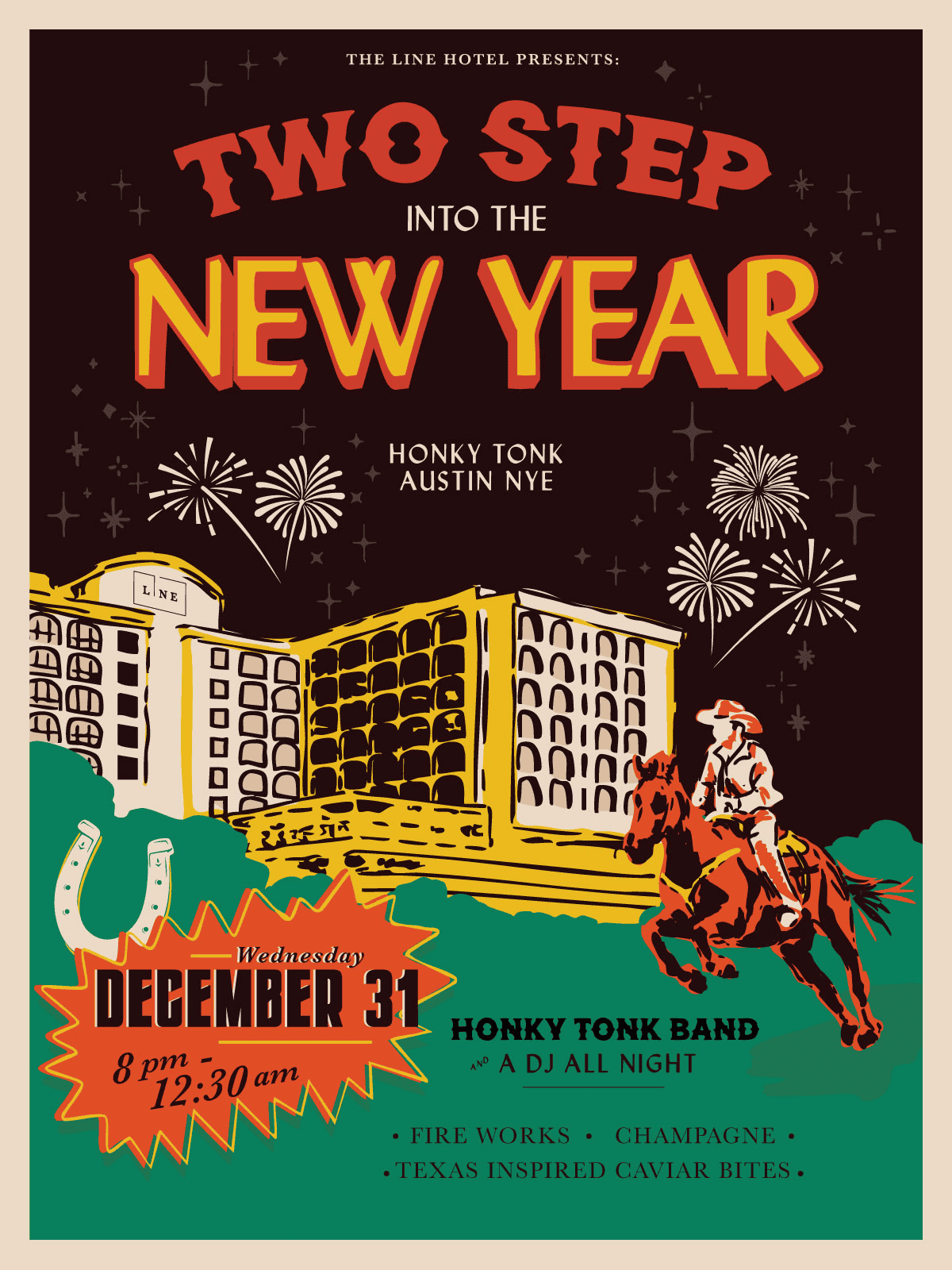 Kick off 2026 in true Austin style at P6 at The LINE Austin with a lively New Year’s Eve celebration on December 31, 2025, from 8 P.M. – 1 A.M., featuring a live honky tonk, a DJ set leading into midnight, room to dance, specialty cocktails, light bites, and plenty of good energy. Tickets include live entertainment, photobooth access, specialty cocktail bars, two drink tickets, Texas-style bites, a midnight countdown with champagne toast, and fireworks views (weather permitting), with early bird tickets at $135 and general admission at $150. Dress to impress with true Texas flair or come as you are and take advantage of The LINE’s “Take the elevator home” special using code GETHERE for up to 20% off rooms. Seating is open and first come, first served.