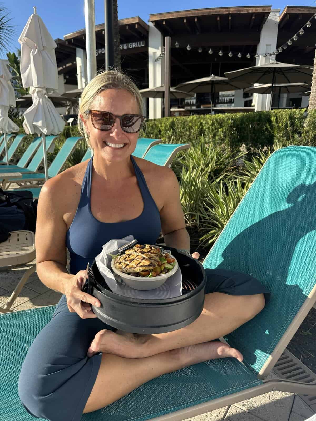 Cruciferous vegetables on the carrot hummus plate at Falls Pool Bar and Grill at Orlando World Center Marriott was my personal favorite for high fiber whole food to consume my daily fiber from the earth while traveling. (Pro tip: ask for double vegetables, no pita bread.) My guest, Rachael Brown, opted for a Greek salad with kalera mixed greens, grape tomatoes, cucumbers, and roasted red peppers.