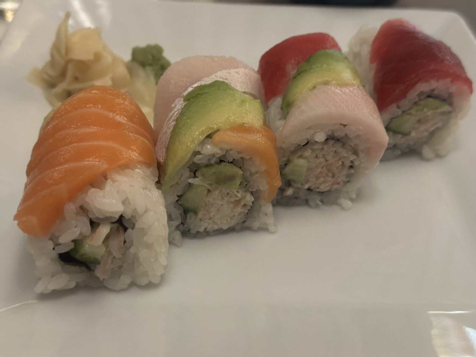 The rainbow roll image above from Mikado Japanese Steakhouse at Orlando World Center Marriott provides 20 grams of protein from salmon, yellowtail, tuna, crab and rice. It was so delicious that I ordered a second for a total sum of 40 grams of protein.
