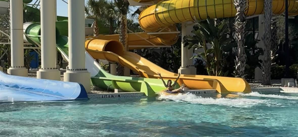 Forbes voted Orlando World Center Marriott’s Falls Pool one of the “World’s Coolest Hotel Pools.” It boasts a 400,000 gallon zero-entry heated pool with waterfalls, two 200-foot winding slides, a 90-foot speed slides, kid’s splash zone and 4 jumbo televisions. (Yes, televisions in the pool, between waterfalls!)
