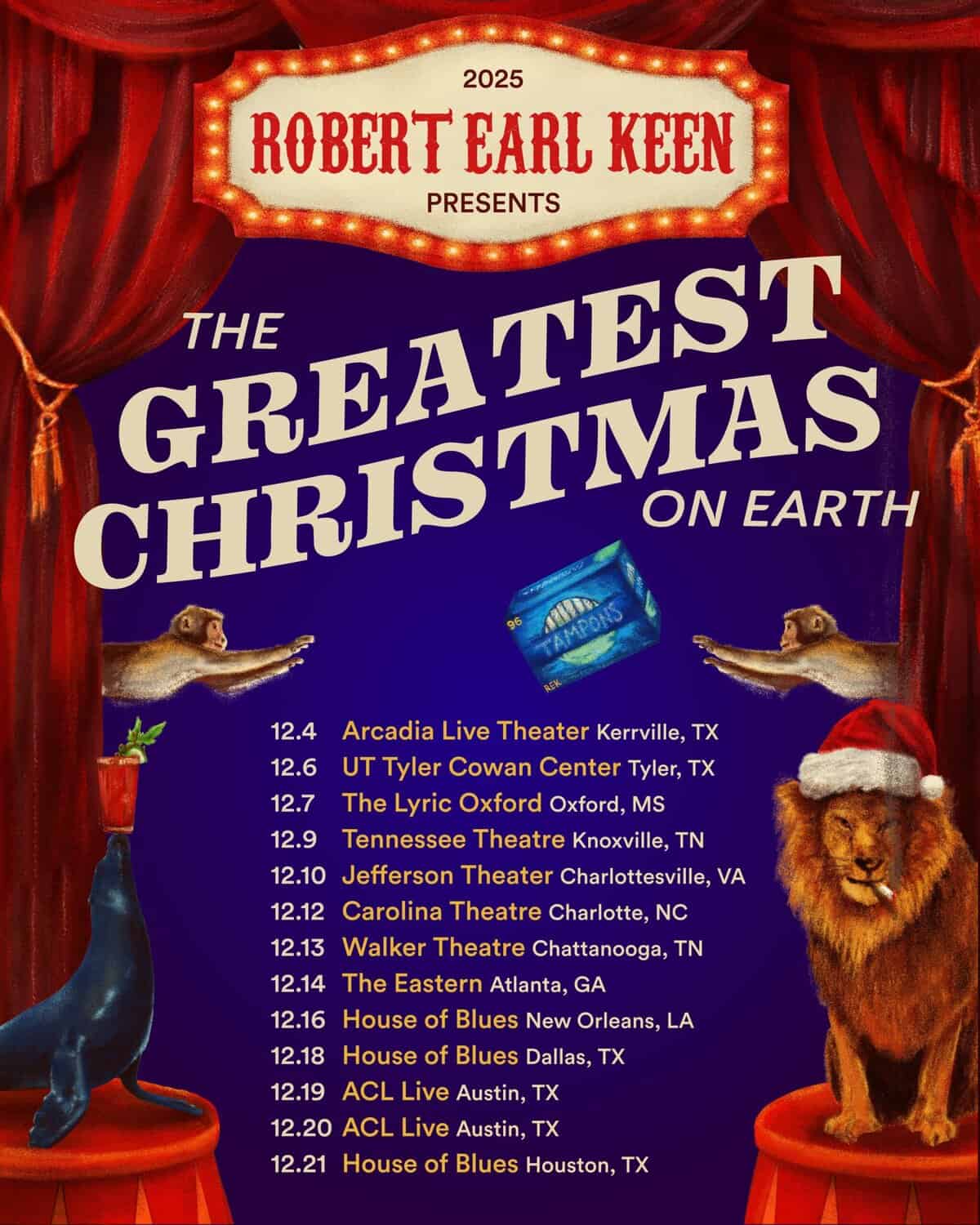 Legendary Texas songwriter Robert Earl Keen is spreading holiday cheer once again with his 15th annual Christmas party tour, The Greatest Christmas on Earth. From Dec. 4 through 21, Keen and his band will take their traveling musical circus across the Southeast and Texas, blending the magic of the season with whimsical circus themes like lions, tigers, tightropes, and clowns, all set to his signature singalong tunes. The tour rolls into Austin on Dec. 19 and 20 at ACL Live at the Moody Theater, offering families and fans alike an unforgettable night of music, laughter, and Texas-sized Christmas spirit.