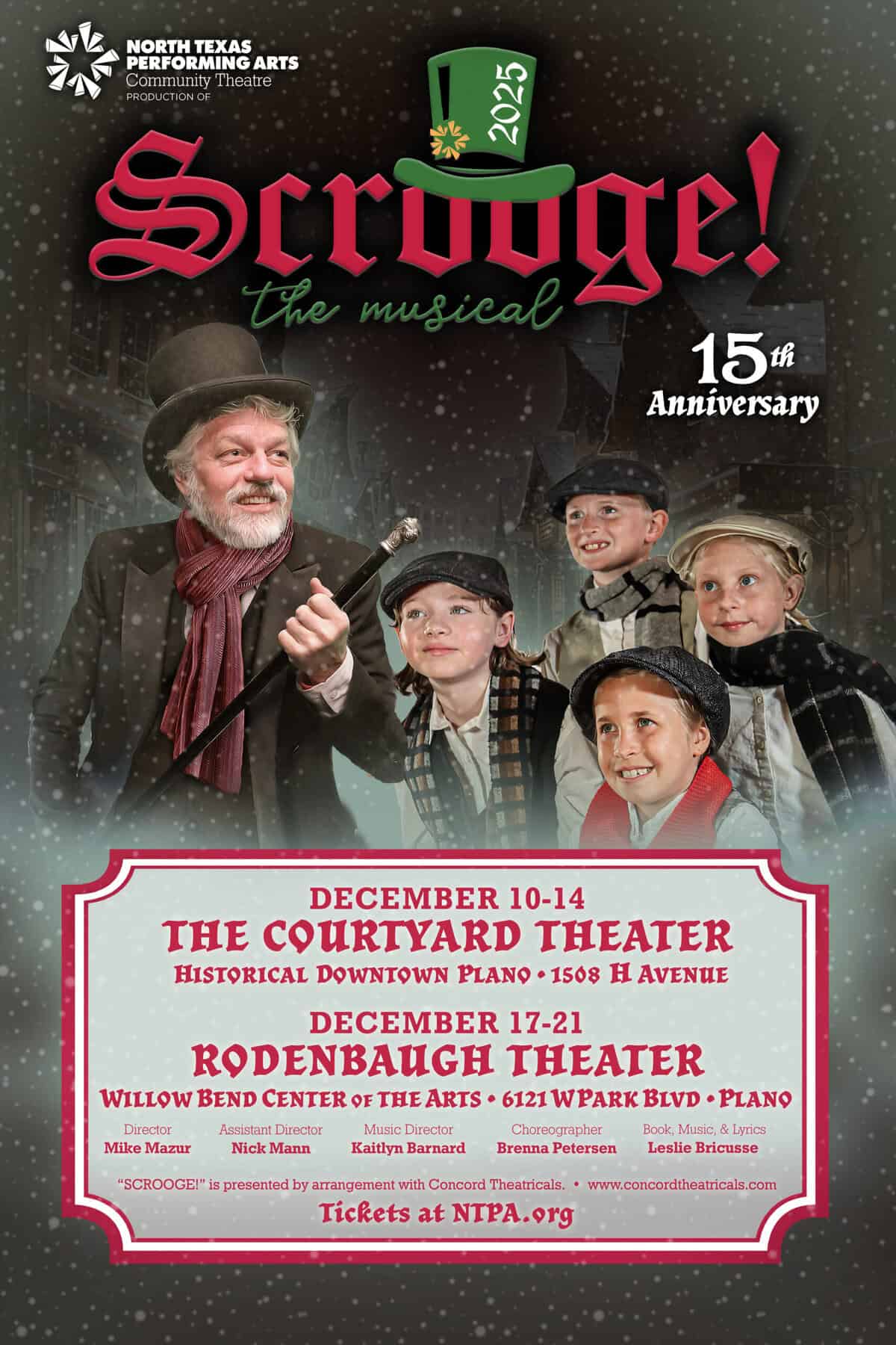 The North Texas Performing Arts presents the 15th Annual Scrooge the Musical from Dec. 10 through Dec. 21, at the Courtyard Theater and Rodenbaugh Theatre. The production features a record-breaking cast of 150 performers, including returning favorites, community leaders, and NTPA alumni. Darrell Rodenbaugh reprises his role as Scrooge for his 125th performance, making him the longest-running Scrooge in Texas. Evening shows begin at 7:15 p.m., with matinees at 2:15 p.m. Special Gift to the Community performances are on both Wednesdays, and an ASL-interpreted show is scheduled for Saturday, Dec. 20, at 2:15 p.m. Tickets range from $13 to $25.
