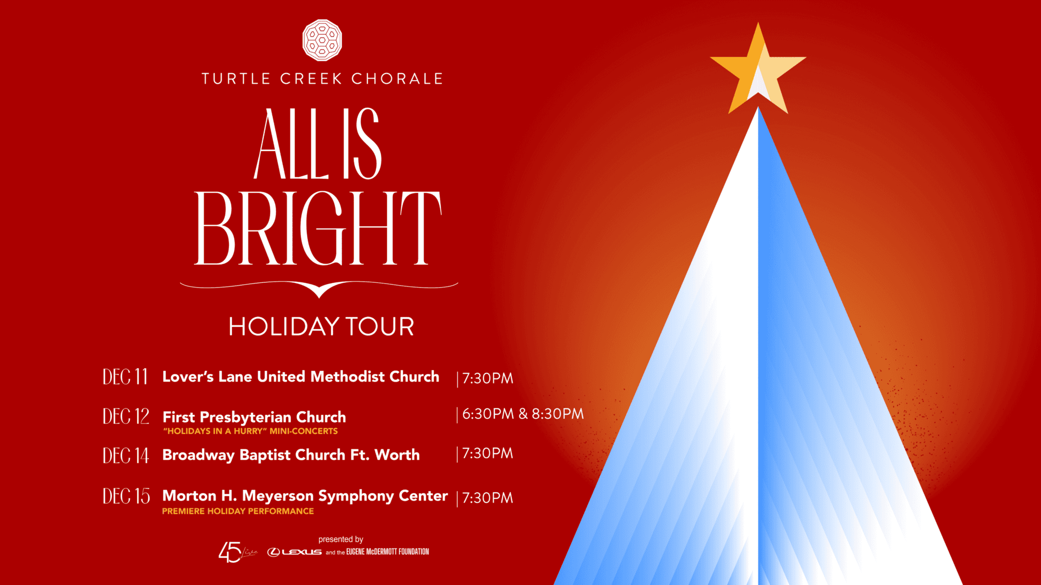 Turtle Creek Chorale’s beloved holiday concert series, All Is Bright, returns this December with four heartwarming performances across the DFW metroplex. This festive program blends timeless classics with new works, celebrating light, hope, and harmony while reminding audiences of the season’s themes of peace, love, and togetherness. Stops include Lover’s Lane United Methodist Church (Dec. 11), First Presbyterian Church of Dallas for two “Holidays in a Hurry” mini-concerts (Dec. 12), Broadway Baptist Church in Fort Worth (Dec. 14), and the Morton H. Meyerson Symphony Center (Dec. 15). Tickets range from $25 to $100, making this a must-see tradition for music lovers seeking holiday cheer.