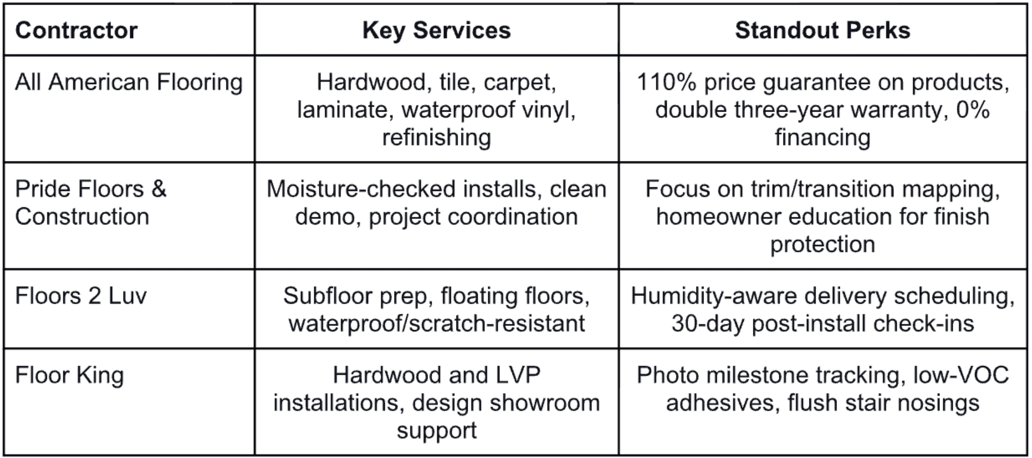 Top-Rated Flooring Contractors — Side-by-Side Comparison