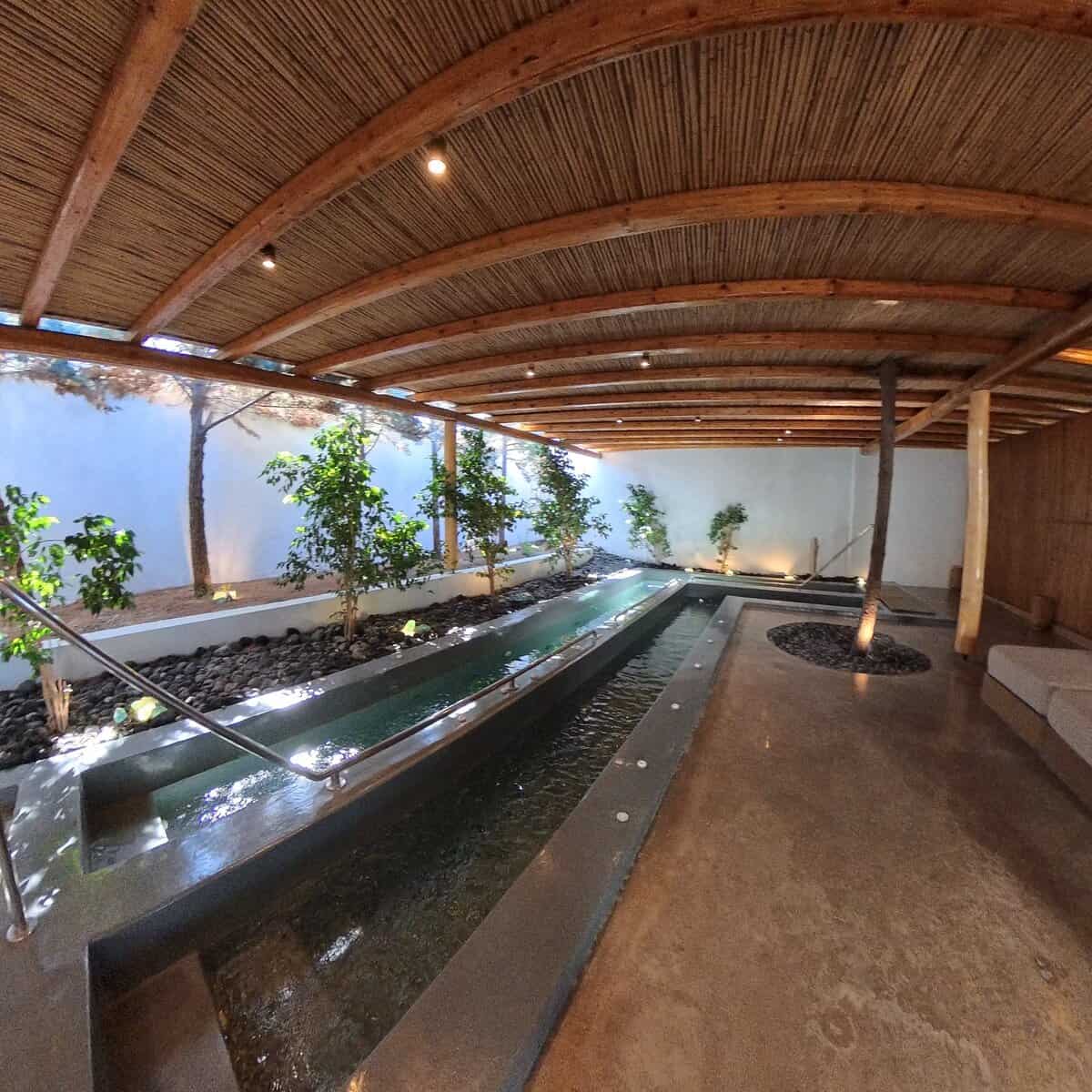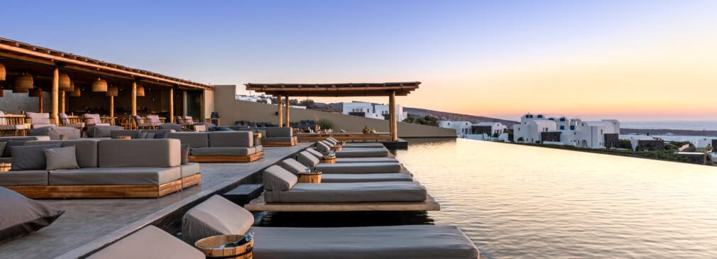 A few other notable features distinguish Andronis Arcadia as a top-tier destination hotel, not only among Santorini’s many options but also within its peer group. Andronis Arcadia has the largest infinity pool on the island, offering one of the most lively and spacious resort pools for fun or relaxation. Arcadia is also the only Andronis property with a conference center, strengthening its role not just as a romantic retreat for couples or a fun family getaway, but also as a corporate retreat set in one of the most scenic locations. Their onsite spa, Evexia Spa, also stands out as a premier spa, where innovative techniques and traditional practices combine for personalized treatments. One of the most innovative treatments is the Kneipp Path, a signature water therapy experience featuring two L-shaped pools, no deeper than three and a half feet—one a brisk cold plunge walk and the other hot—designed to stimulate reflexology and relaxation.