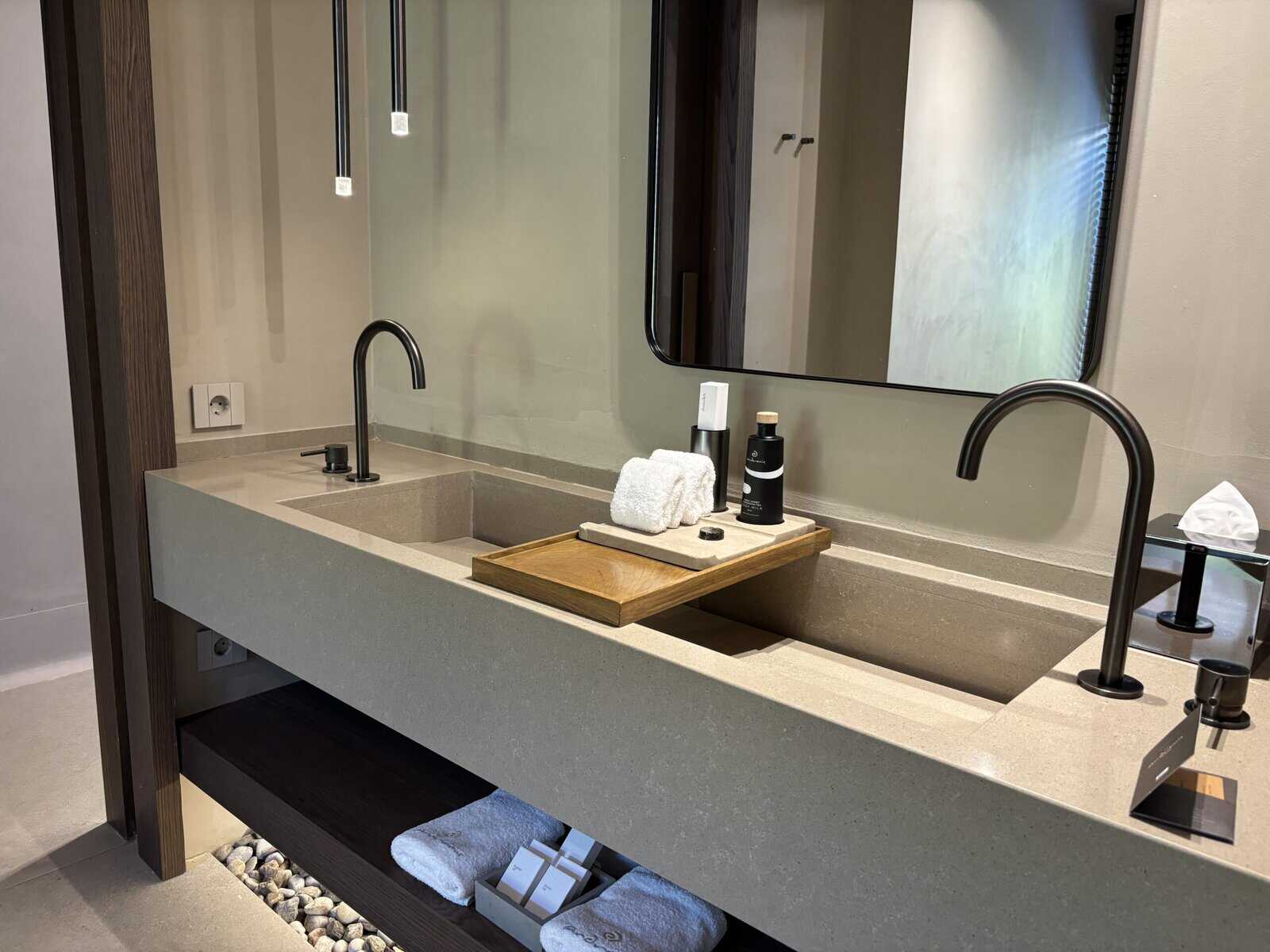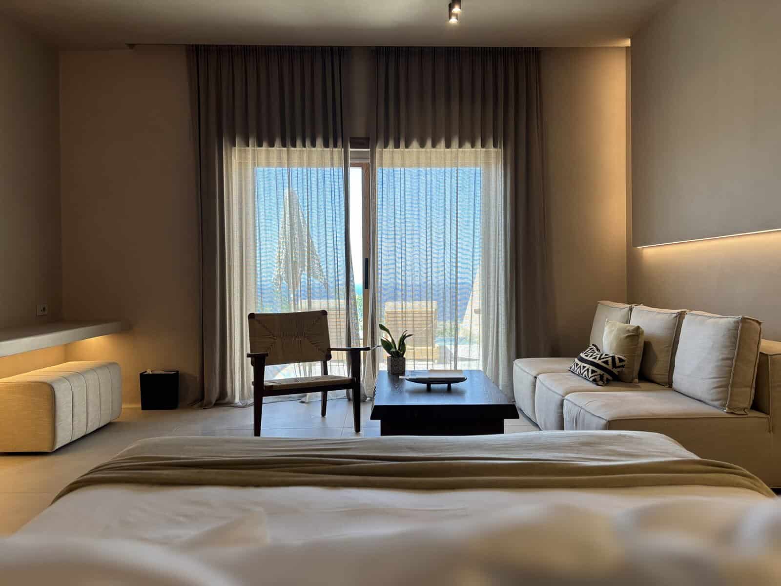 Each suite at Andronis Arcadia embodies naturalist minimalism with raw materials and clean lines. When I entered my room, I was greeted by a calming palette of earth tones, now enhanced by river stone accents in the bathroom vanity and shower. The spacious jacuzzi tub provides another tranquil retreat in an already captivating space, boosting the sense of peace during this Greek island escape.