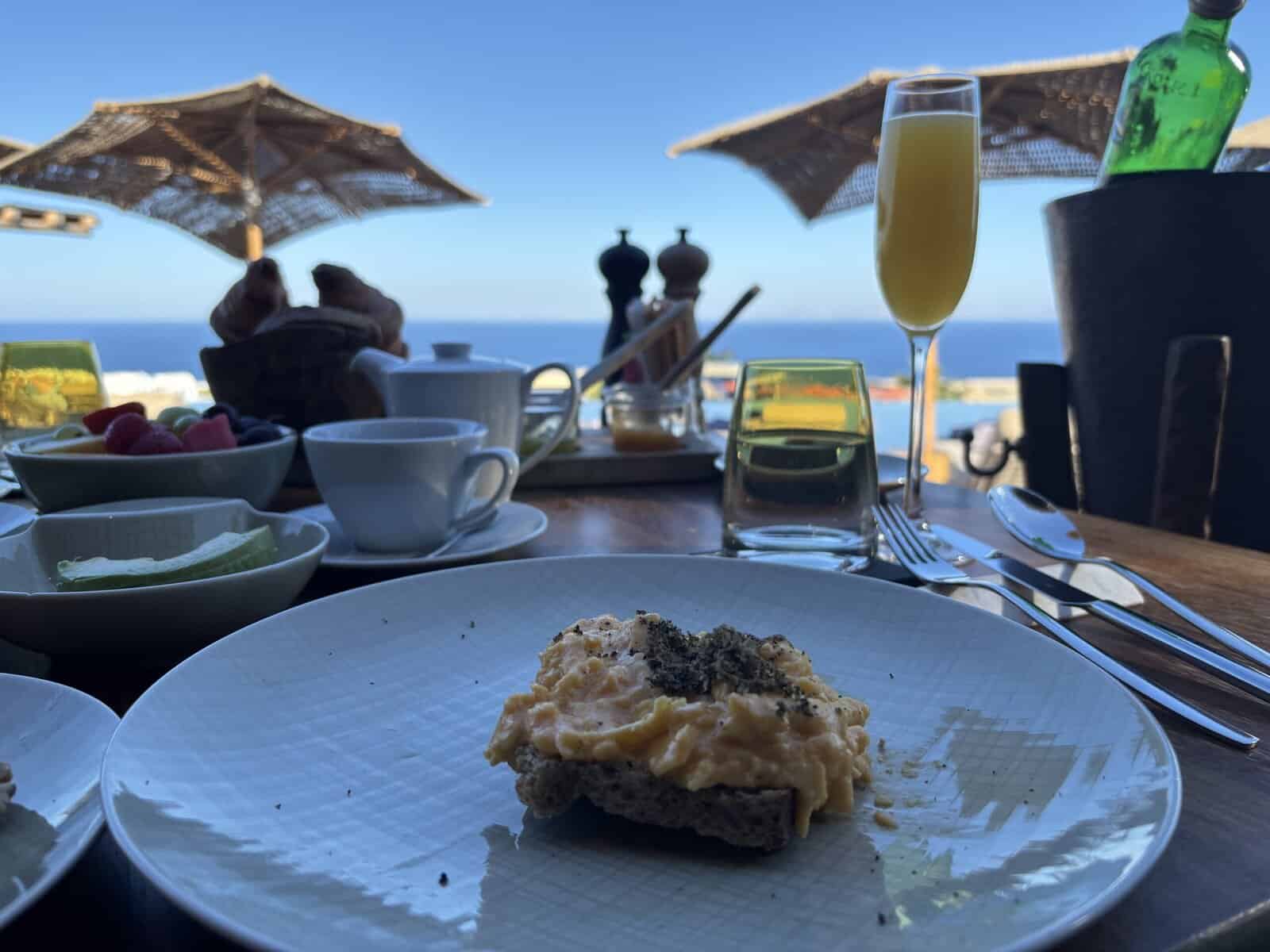 It was a great pleasure to find that dinner at Pacman was only part of the culinary experience, as every stay at Arcadia includes breakfast, allowing each morning to begin with a variety of fresh options. Savory dishes, such as the Truffle Toast with local eggs or the Salmon Benedict, are hearty and set the tone for a day of exploring the streets of Oia. Oranges and grapefruits are pressed daily, providing a refreshing burst of flavor. It also adds a touch of nourishment to each mimosa. The breadbasket, featuring house-made artisan breads and jams, is not to be overlooked, as its rustic presentation and lingering notes of butter and warmth leave a lasting impression.