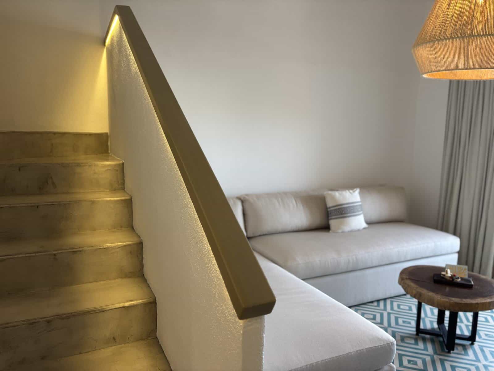 Every inch of the open-air hotel radiates authenticity and warmth, from the pebbled mosaic entrance to the stretch of terracotta tiles lining the lobby. Once inside, dark wood beams and planters filled with vibrant greenery stand out against the white stucco walls, illuminated by the sunlight seeping in, creating a harmonious mix of natural elements that invites relaxed lounging or intimate gatherings. White curtains hang in the halls and archways, adding a modern bohemian touch throughout the hotel’s decor, ensuring that every detail—from the stitching, woodgrain, and tile to the intricate Moroccan-inspired light fixtures—is purposeful, reflecting Cabo’s distinctive coastal charm.