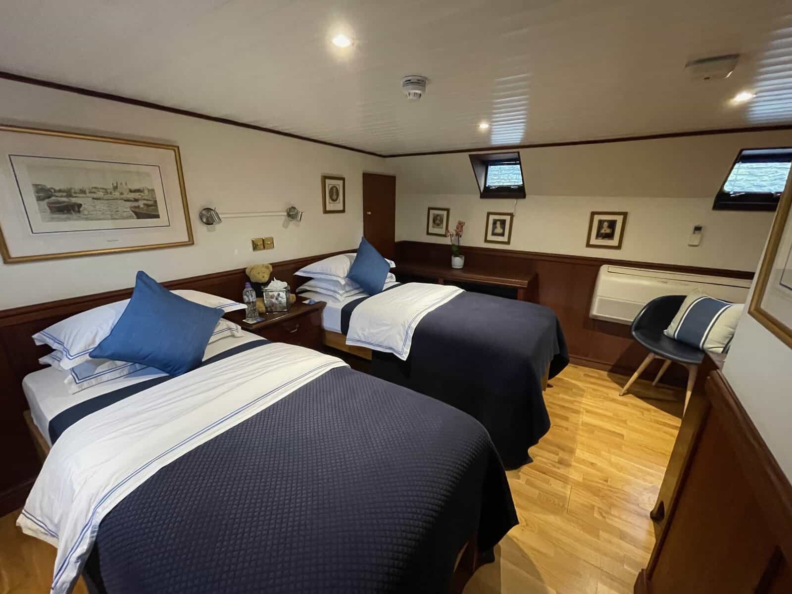 There are four guest rooms with either a king bed or twin bed configurations. All rooms have ensuite bathrooms with heated towel racks, and were surprisingly spacious for a barge. In keeping with the rest of the boat, rooms are decorated in dark blues and wood tones. I had the Henry VIII room, complete with framed prints of Henry and his six wives watching over me. The beds were comfortable, rooms were air-conditioned, and there was daily maid service.