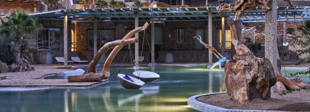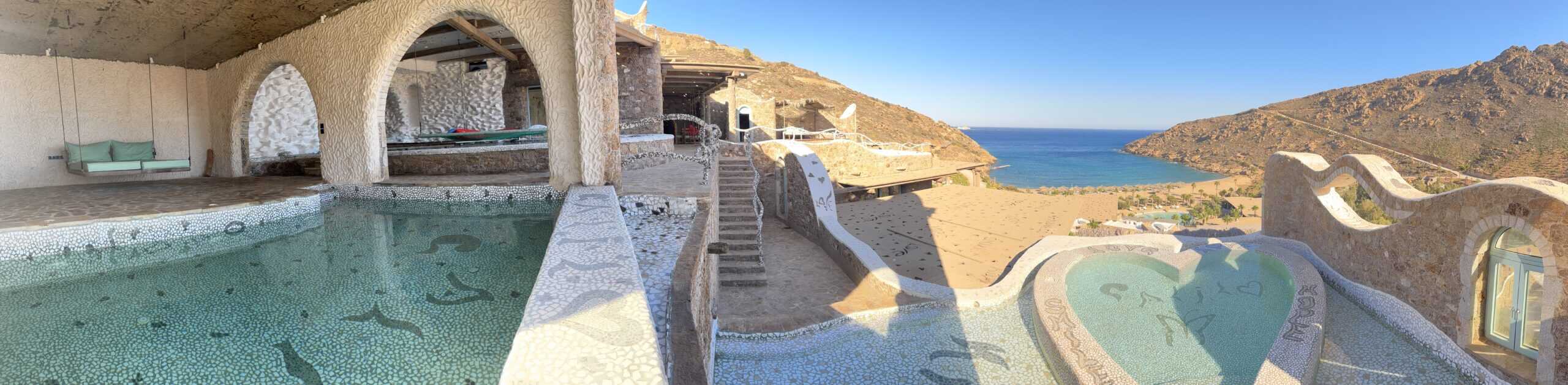 The room began with a tunnel leading from the door to a bright glow where daylight waited at the end. It was filled with mosaic artwork of dolphins and waves, carefully placed by hand to echo the seafaring atmosphere surrounding Calilo. A bridge floating over a stretch of calm water cooled by the shade connected to the rest of the suite, where just beyond the light at the tunnel’s end, a stunning mountain backdrop awaited. There was also a playful arrangement of bubbling pools and, in the distance, the expansive ocean feeding into a private cove nestled at Calilo’s base.