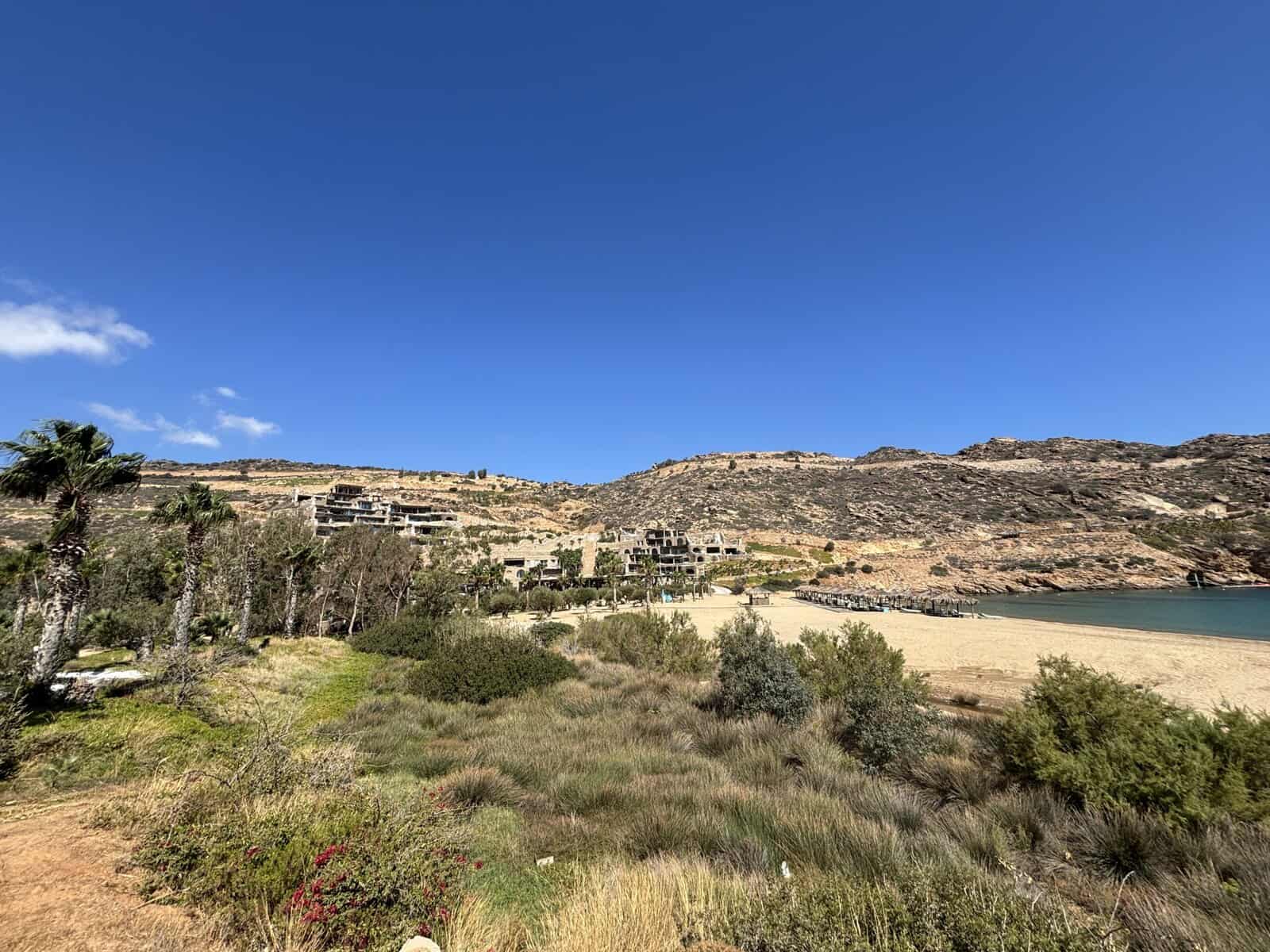 The drive to Calilo follows a winding road up a rugged mountainside that’s arid, rocky, and scenic as it overlooks the Aegean Sea. It zigzags with switchbacks, offering lovely views of the cliffs dropping into the village and then the water. The road was bumpy for the first twenty minutes from the port until we reached a stretch of smooth highway that felt freshly paved, dulling the sounds of the road and leaving only the chaparral view. “This road is private,” the driver told us, which I would later learn is one of many improvements the Michalopoulos family had invested in the island of Ios, while still keeping much of it untouched and undeveloped compared to Mykonos and Santorini. This anecdote is essential to Angelos’s philosophy of life, which is more of a practice than philosophy, as the hotelier owns 30% of the land in Ios and has only developed 1% of it.