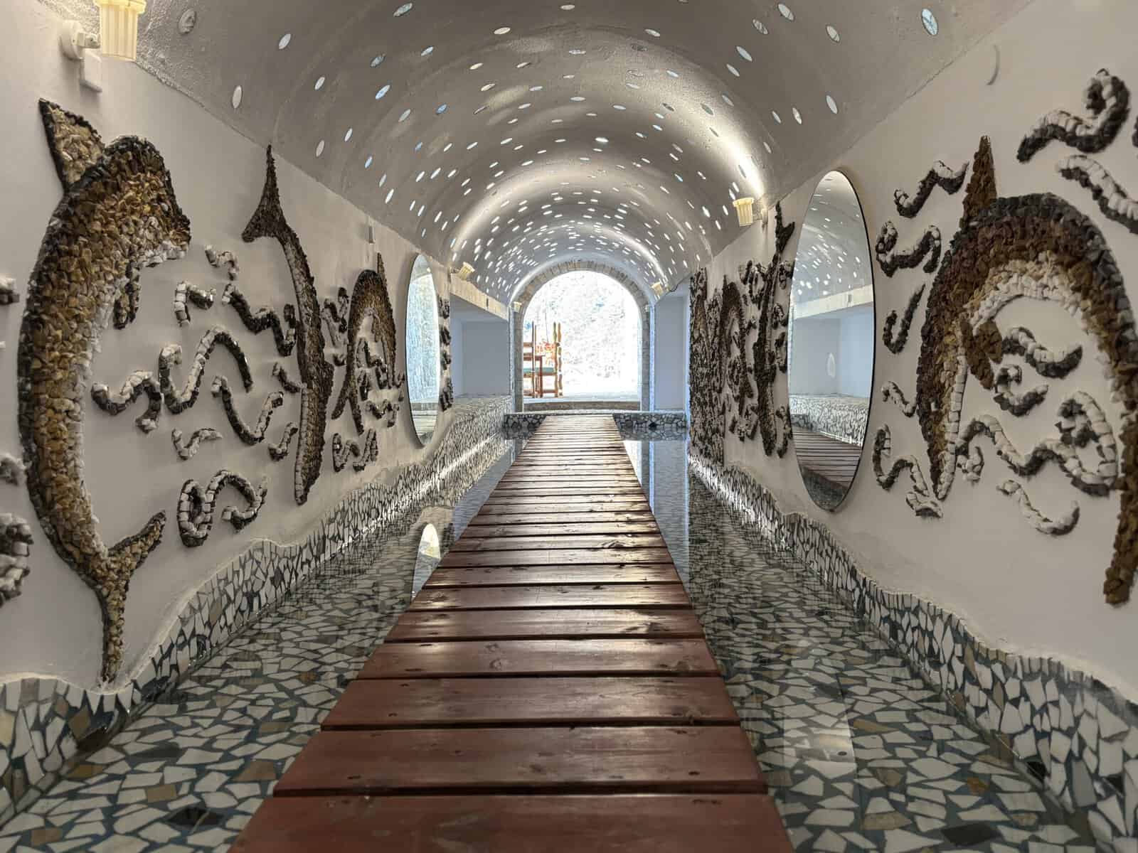 Throughout the property, I saw no wasted or unused space. A waterfall tunnel at the entrance combines Angelos’s own art with a wood-planked bridge over a gleaming stream of radiant blue water, creating a welcoming atmosphere unlike any other that wows and inspires wonder. All over the property, the ceilings are etched with messages of the Michalopoulos mantra, radiating light among shadows and filling every corner with little reminders of love. Using stones from the mountain, Calilo features a bounty of hand-placed mosaic pieces along the railings, pillars, and accents throughout the rooms, creating a harmonious balance between hospitality and nature. Mosaic messages of kindness and positivity, crafted from these mountain remnants, are also hand-placed along the walls and overhangs, leaving no stone unturned to fill guests with enthusiasm during their stay at Calilo. All these elaborate elements create moments that inspire positive emotions.