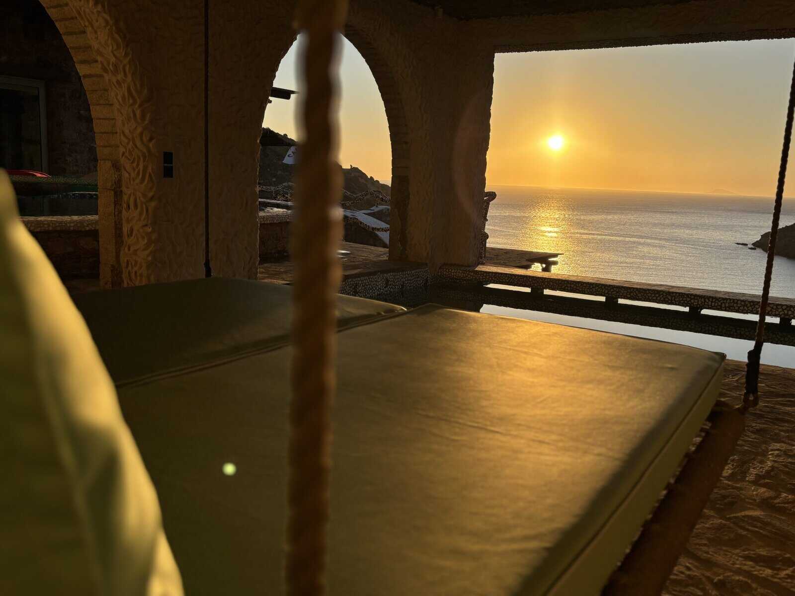 At the Rebel Souls Heart Suite, there is no shortage of spots to rest and bask in the warmth of the Mediterranean weather, as the spacious suite offers many relaxing amenities, which we thoroughly used. A cool white cave with a swinging bed over water provided privacy and views of the distant ocean. We fell asleep on an additional outdoor bed shaded naturally by dried palm leaves and awoke up to a mountainous backdrop and the ocean darkening into a rich sapphire hue as the sun set behind Calilo. Each luxurious area was equipped with a place to hold a phone, camera, or speaker and a wall socket, a design that anticipated our every need and made this stay memorable and carefree.