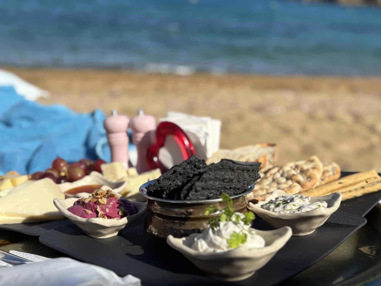 Here, a beachside menu extends from Calilo Restaurant, where we ordered and enjoyed a trio of Mediterranean dips and charcuterie with local cheese, along with cocktails and mocktails served by friendly staff. We found peace here, relaxing first under the shade of dried palm trees in the canopy and then on a lounge chair facing the sun, listening to waves gently crash against the shoreline.