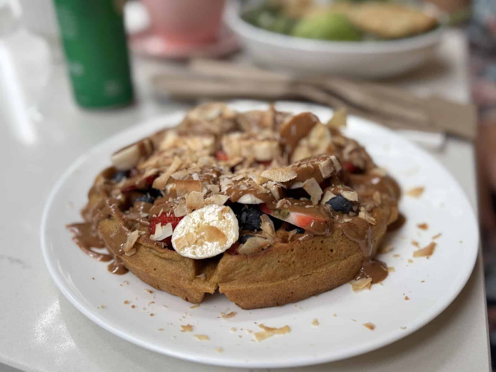 A standout among the breakfast menu is without a doubt the Gluten Free Carrot Waffle. Thick, fluffy, and cooked to a golden brown, topped with blueberries, strawberries, bananas, almond butter, and coconut flakes, the Carrot Waffle is sinfully sweet and indulgent without the guilt.