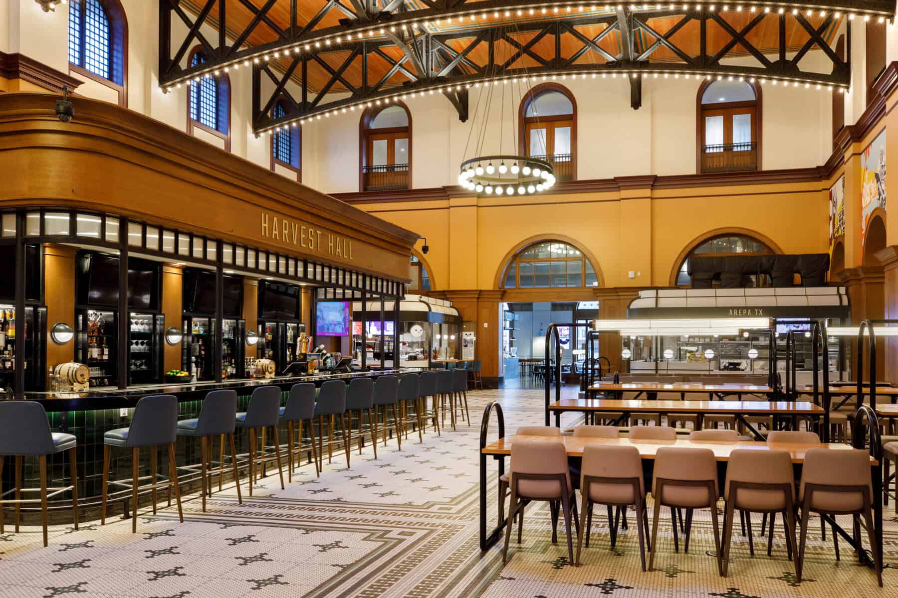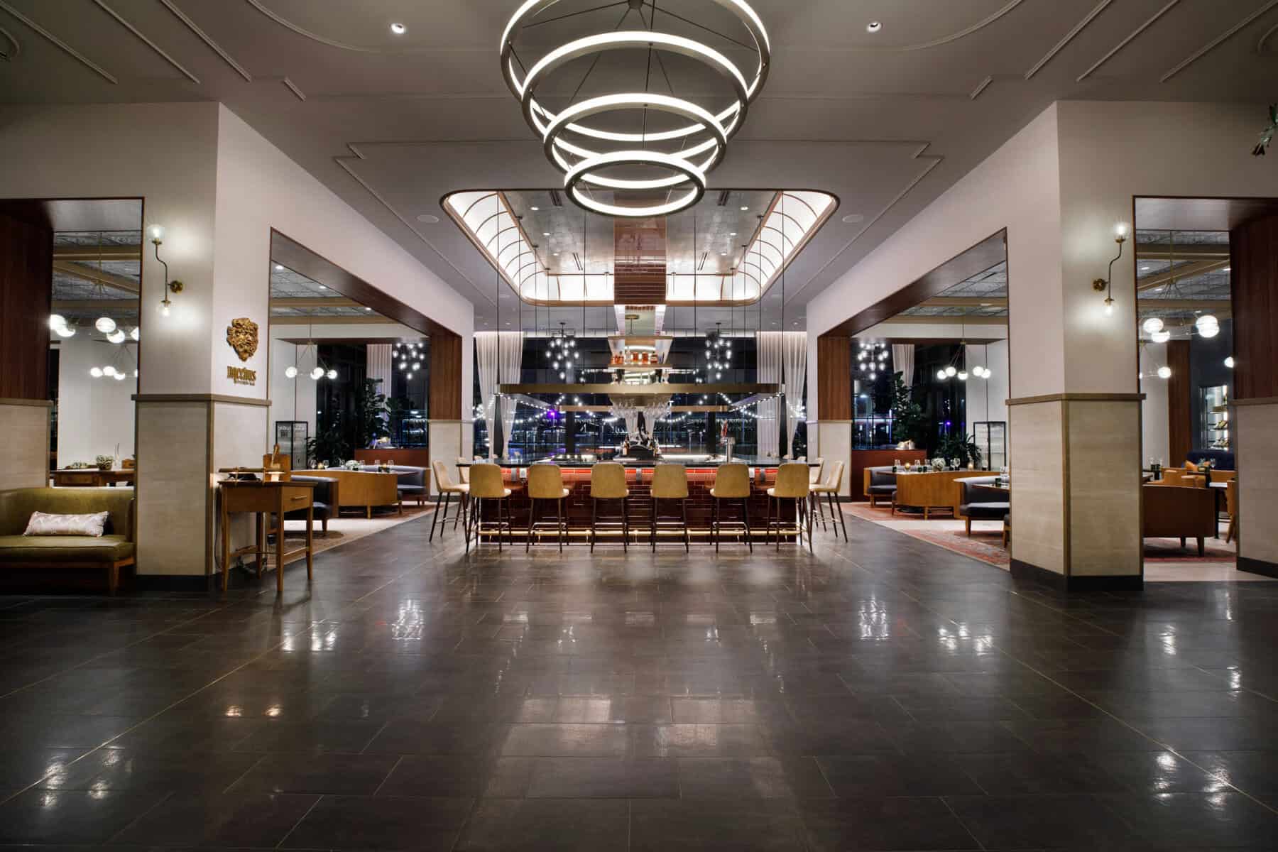 Hotel Vin sits between a public parking garage and Harvest Hall, a city-owned food hall featuring eight kitchens in a modern food-court format. Inside, Third Rail hosts live music and seasonal themes, including Thursday-night karaoke—complete with a live band!