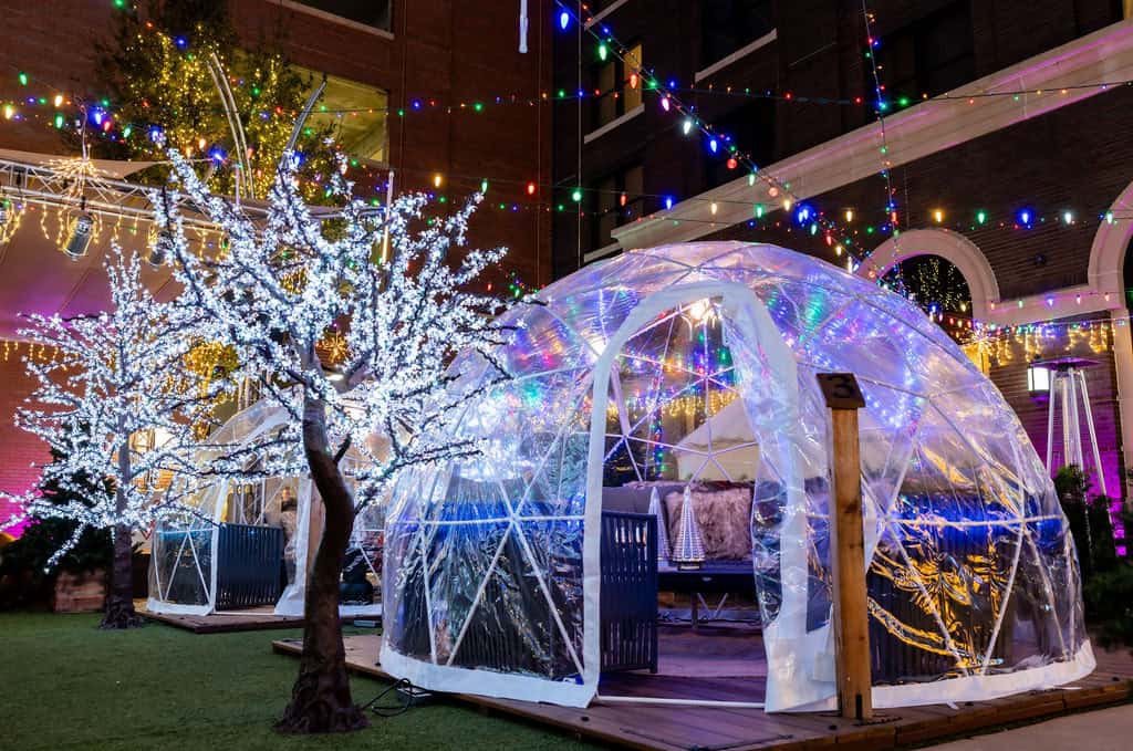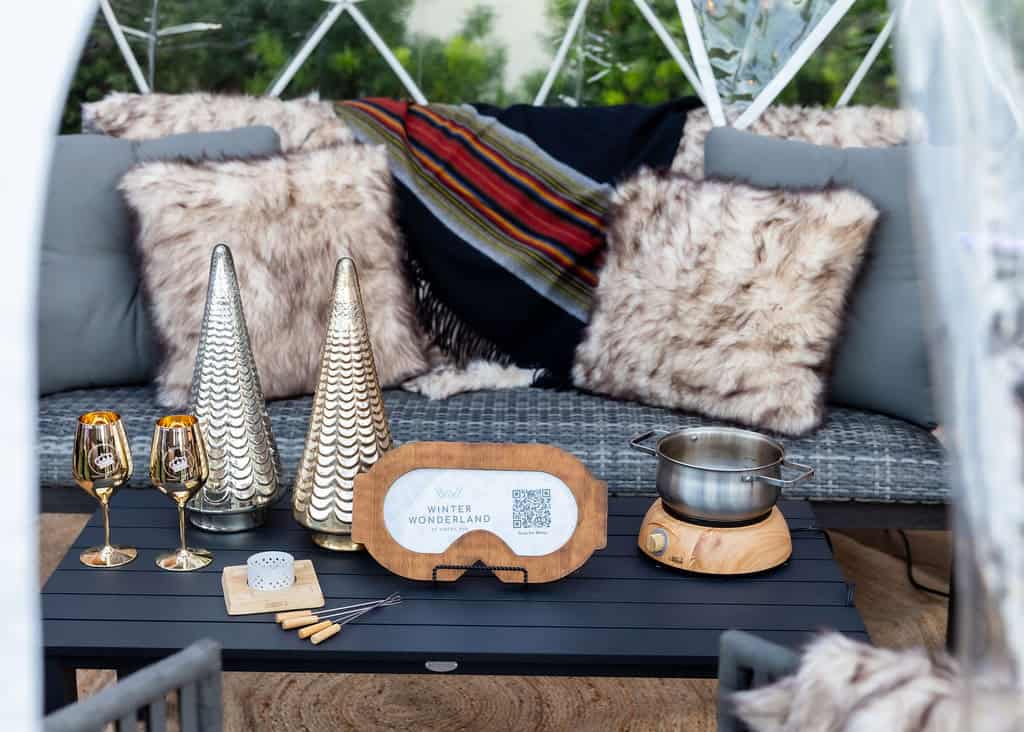 Behind Bacchus, the Wine Yard offers live music seasonally with the Grapevine Vintage Railroad as a nostalgic backdrop. During the winter months, this space transforms into a magical experience featuring nine private “winter bubbles” from mid-November through Valentine’s Day. Each 90-minute reservation includes cheese fondue for four to five guests and champagne, all beautifully illuminated with holiday lights.
