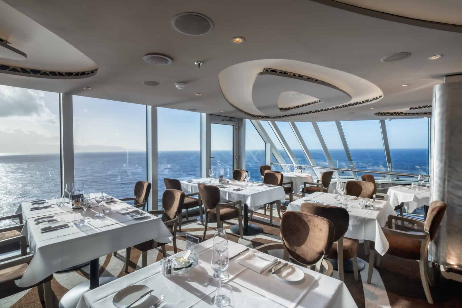 The Yacht Club Restaurant. Photo courtesy MSC Cruises - Top Sail Lounge: A wall of windows provides panoramic ocean views while guests enjoy handcrafted cocktails, gourmet appetizers and desserts. Perfect for sunsets, early evenings, or when you simply want to enjoy an after-dinner drink and live music before bed.