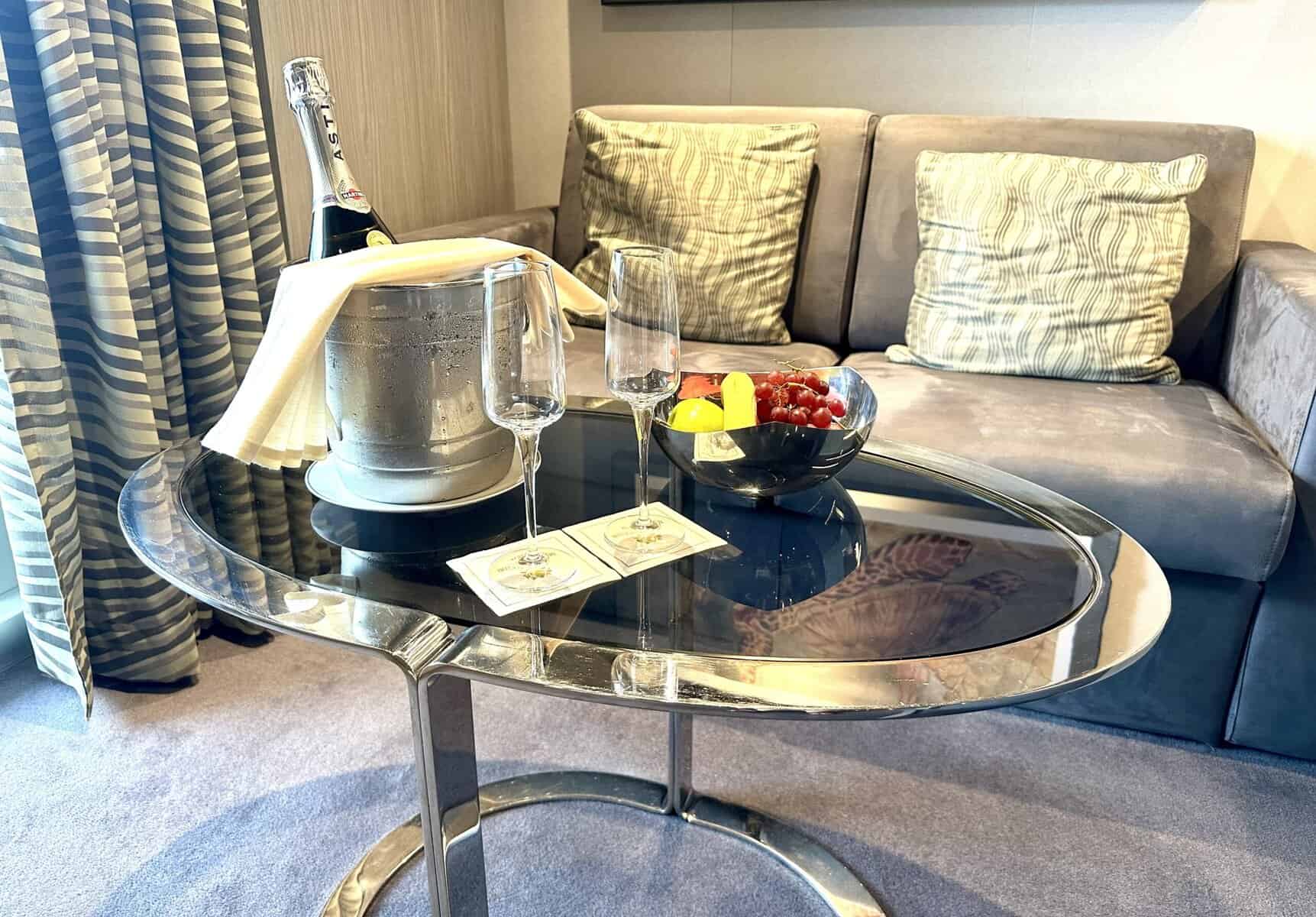 When we sailed out of Miami, our driver pulled up to the dropoff area designated for Yacht Club guests. We left our bags with the Yacht Club team and were escorted inside the terminal where our butler was waiting. He reviewed our tickets, checked us in, and then escorted us to security. It took 10 minutes, at the most, to drop off our luggage, check in, and go through security! After clearing security, we were offered glasses of champagne and then immediately led onboard the ship, up to the 16th floor and into the keycard-secure area that is the Yacht Club. We were shown to the lounge where drinks and snacks were offered as we waited for our suite to be available (which was a mere 5 minutes later).