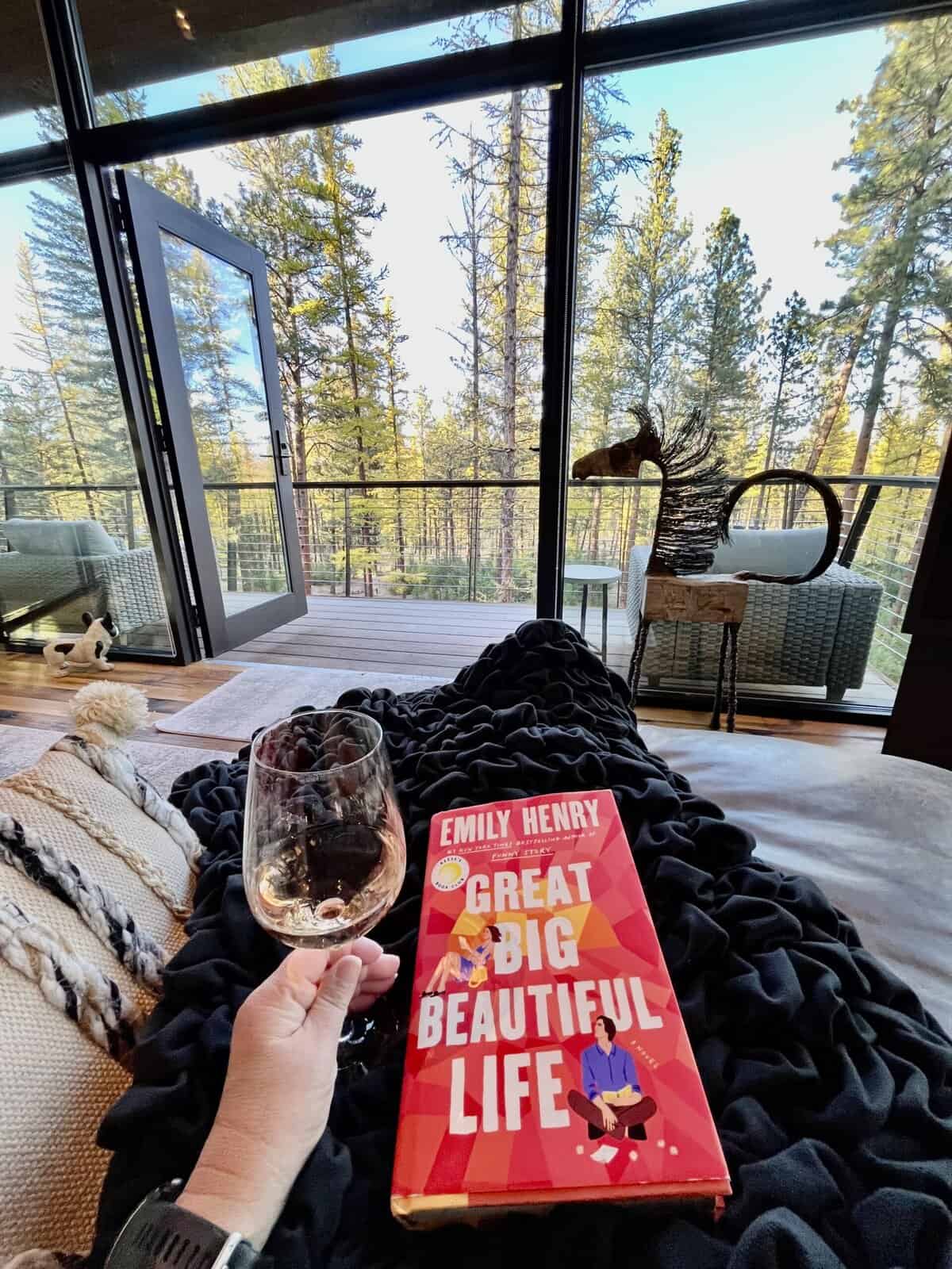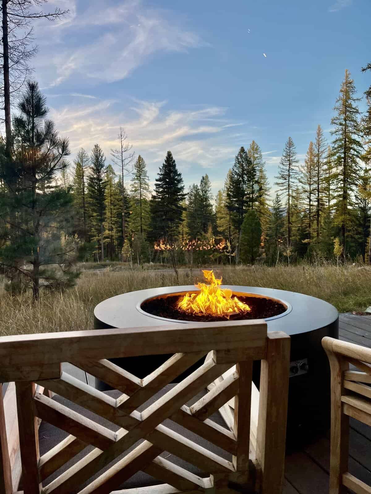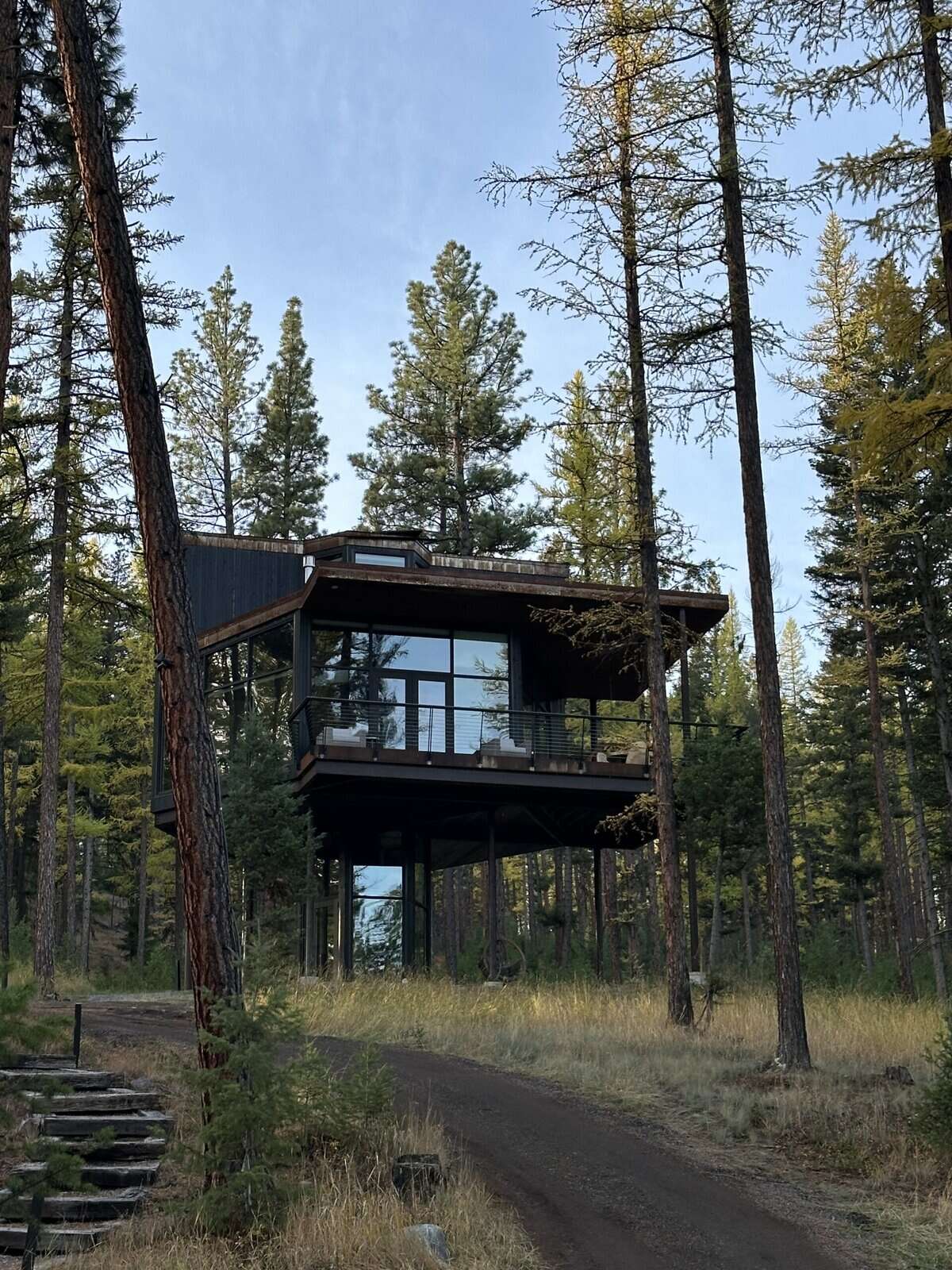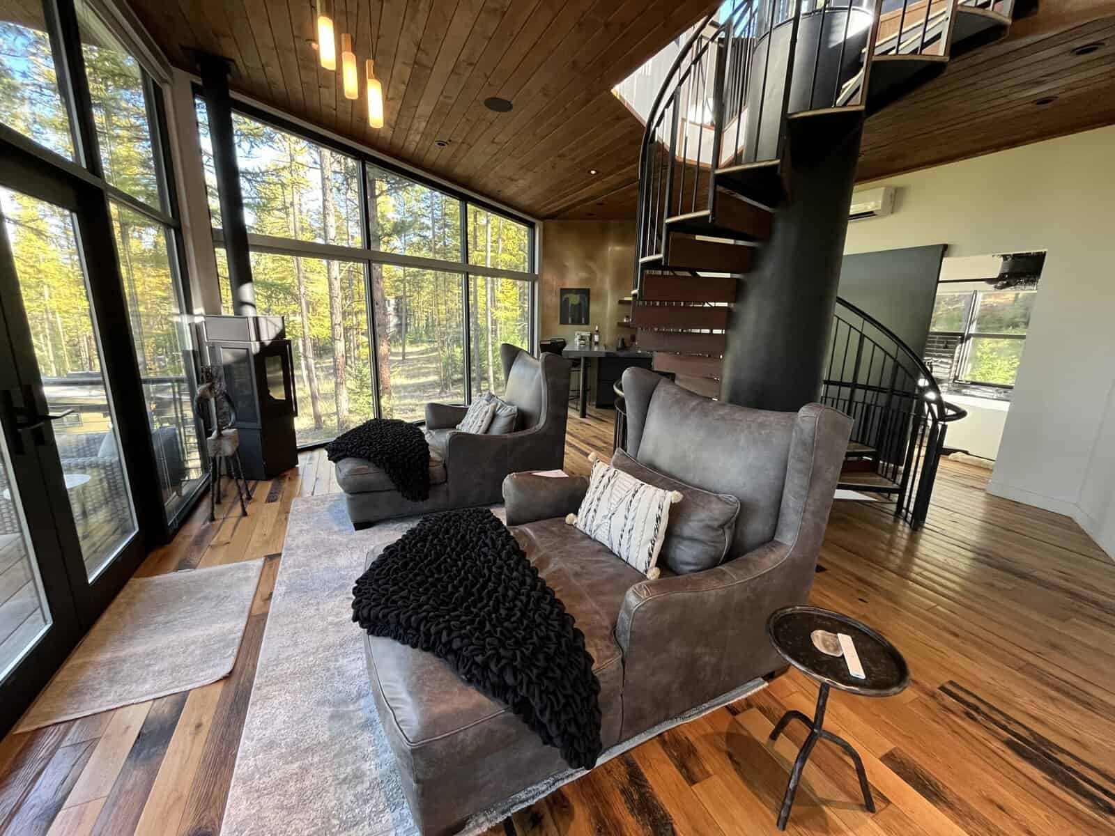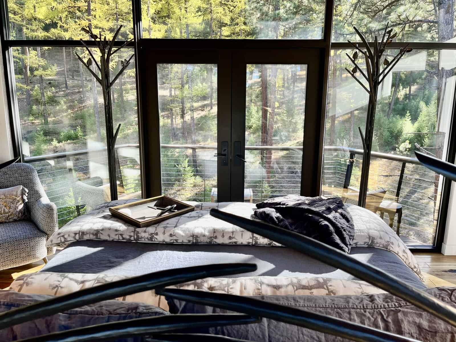The main floor featured a cozy living area, fireplace, and oversized chaise—perfect for curling up with a good book and a glass of rosé as golden leaves showed off outside. Upstairs, the bedroom’s panoramic windows made waking up to the Montana woods an unforgettable experience.
