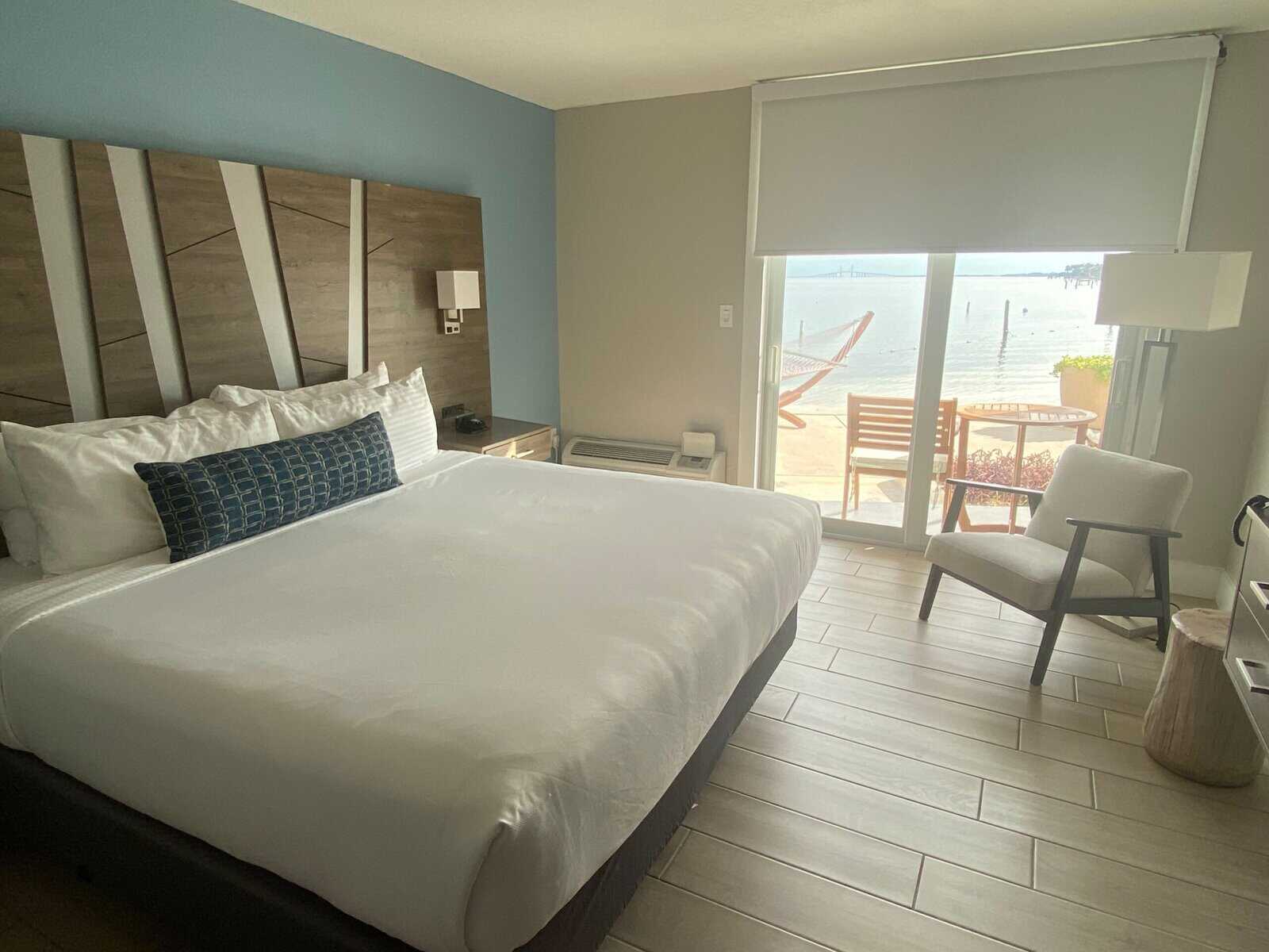 From Tampa International Airport (TPA), the drive to SkyBeach Resort typically takes 30 minutes. From the highway, it looks like a modest motel. In the lobby, friendly staff greet you, walk you through the details, and make sure you’re ready for your stay. If your room is farther out, an employee assists with luggage and takes you to your room via a golf cart. The coolest part of check-in? Instead of a key card, you’re given a wristband that unlocks your room.