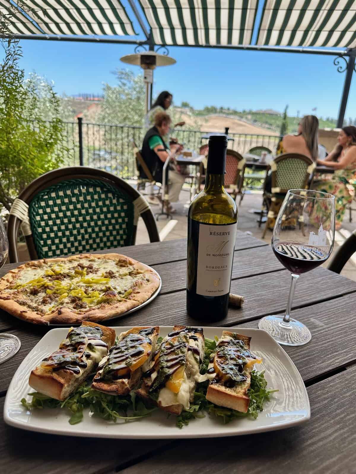 Stepping into Mercato di Vienza feels like walking into a small-town Italian market — shelves lined with spices, artisanal pasta, and gourmet treats ready to turn any dinner at home into a feast. Order lunch from the counter (we recommend the arancini, caprese bruschetta, and pistachio pesto pizza, paired with a Monségur Cabernet Franc) and enjoy it on the patio overlooking the rolling property.