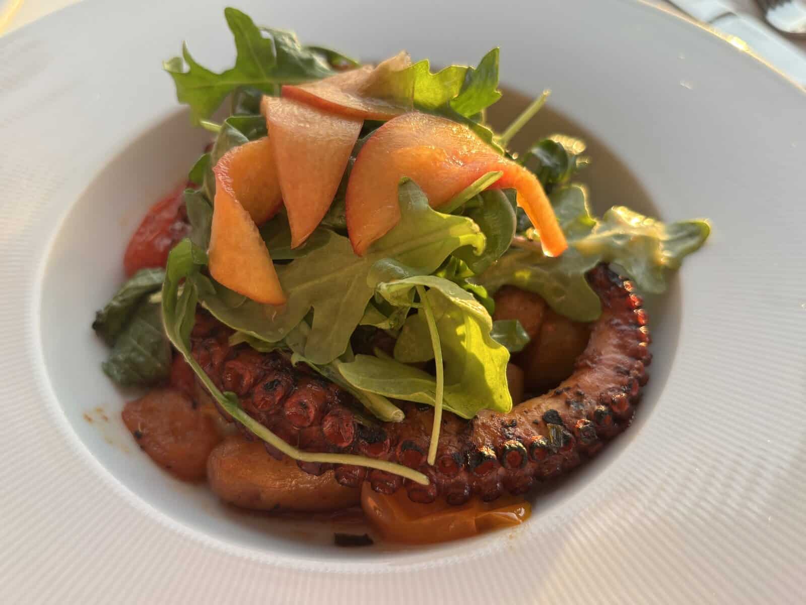Another exquisite dish is the Grilled Gochujang Octopus, highlighting a blend of Asian-inspired flavors with roasted cherry tomatoes, yuzu, and a gochujang glaze, served alongside crispy fingerling coins.