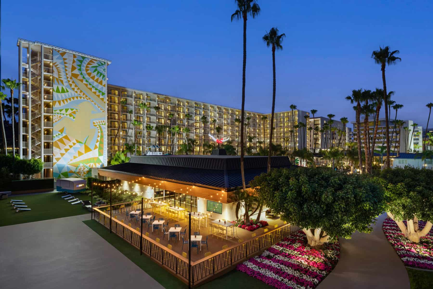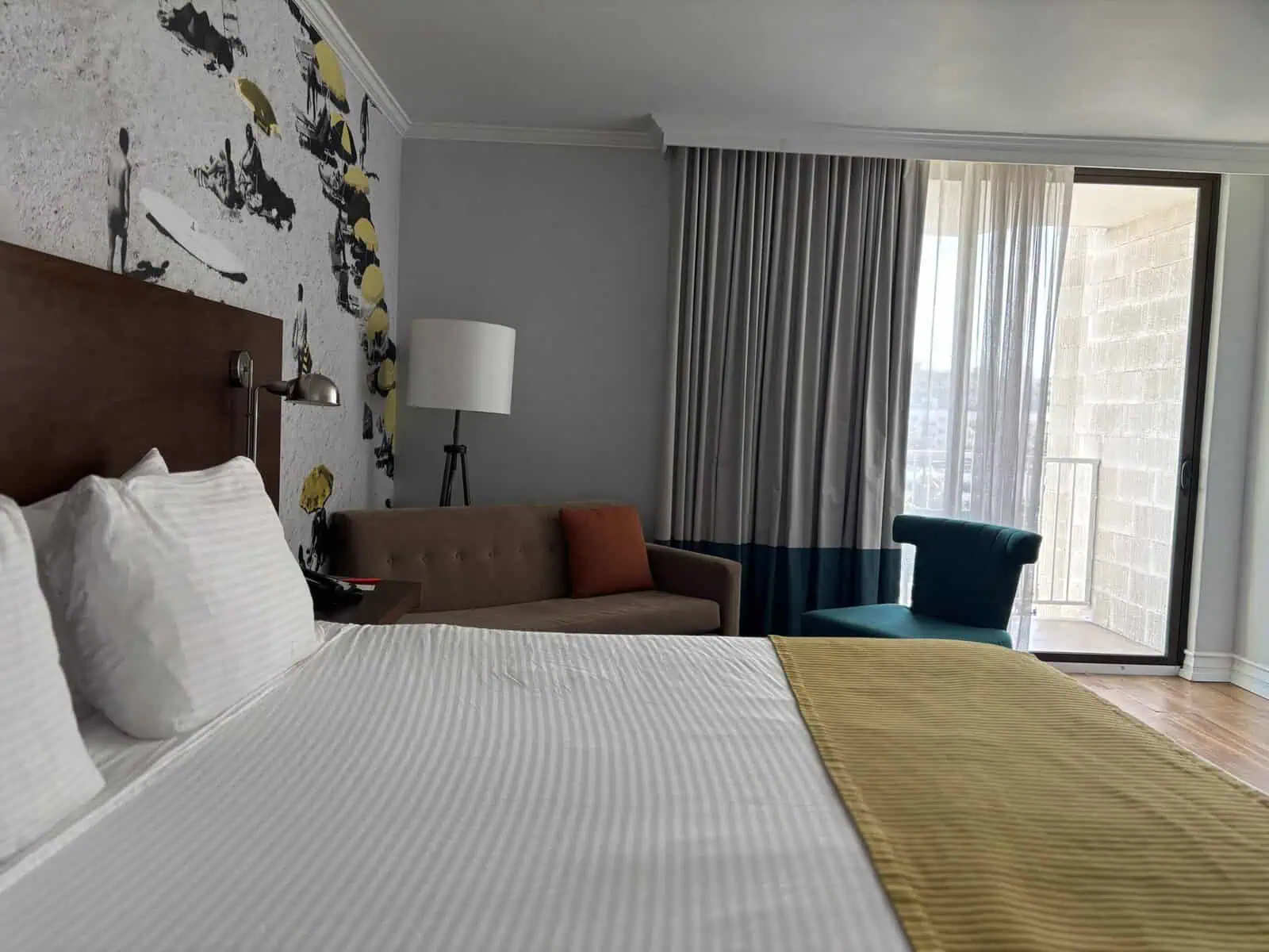 With all the excitement, it’s completely understandable to seek a peaceful spot for mindfulness. The central tower overlooking the resort pool exudes a calming presence, thanks to its views of the San Diego rocky hillside. The private balcony invites slow mornings with a coffee in hand, gazing out at the hazy hillside as the resort gradually awakens. Inside, the murals and décor are playful reminders of simpler times, seamlessly blending retro beachside fun with contemporary design.