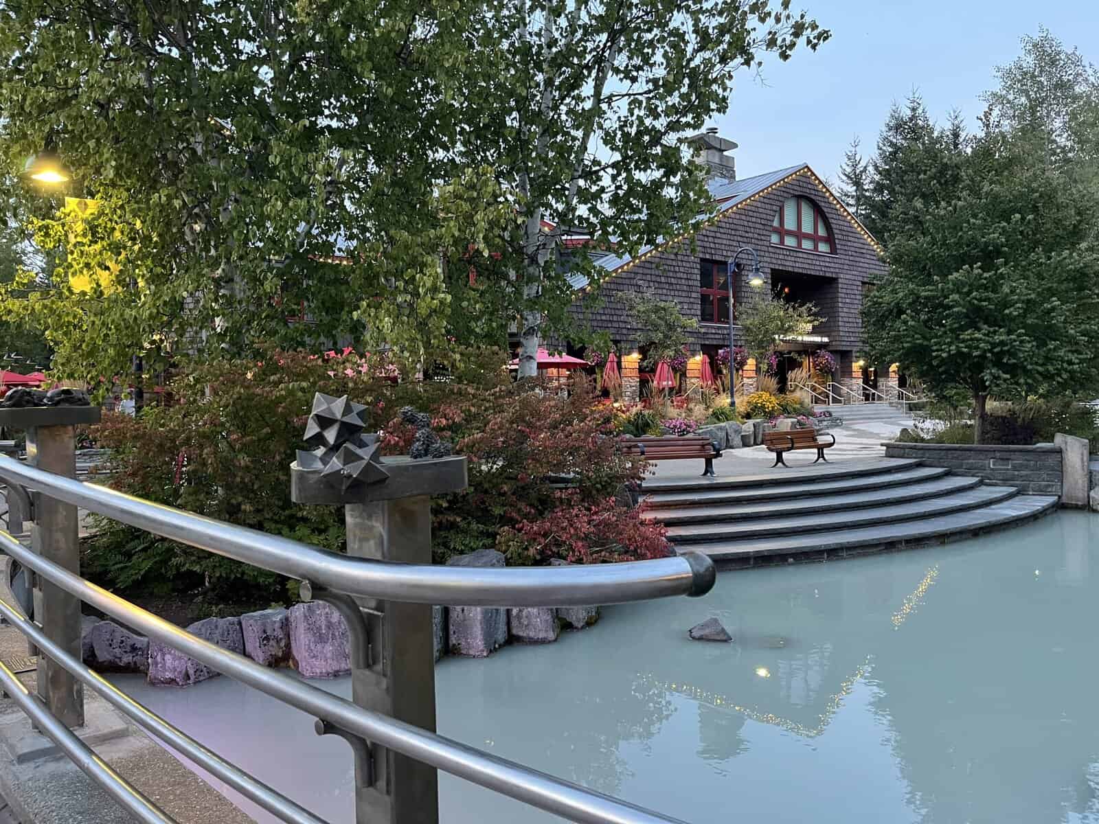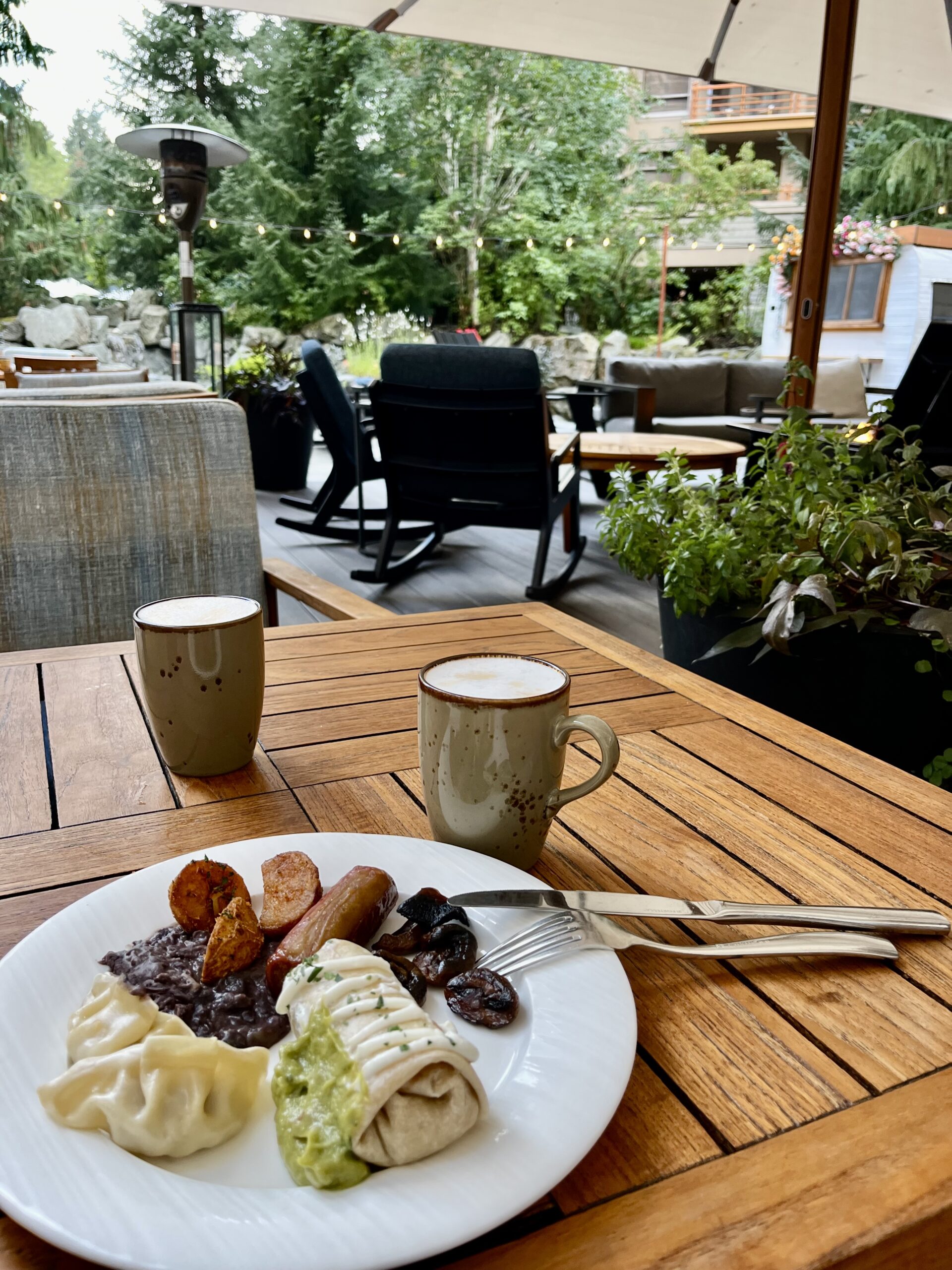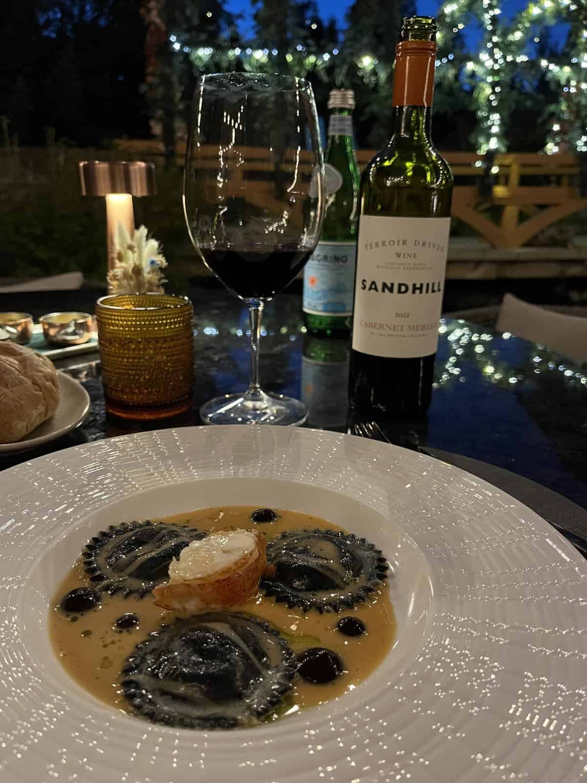 Sidecut Steakhouse: Dine alfresco under fairy lights with the trickle of a waterfall nearby. Their seasonal pre-fixe menu ($68 CAD, which is only $50 US) is a must, especially paired with a signature cocktail like the Fraser River or a Canadian cabernet. We were dazzled by a first course of creamy pumpkin soup (made with olive oil, not cream!) topped with tortellini and fried sage. The next course wowed with perfectly prepared scallops, followed black garlic lobster and crab ravioli.