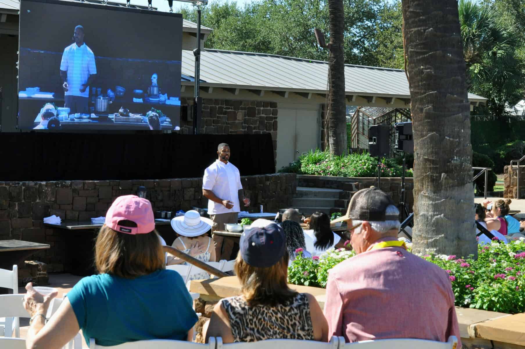 The following morning, though not too early, the Wine, Dine and Jazz Festival picks up where it left off the night before. Around lunchtime, the invited chefs, who are a who’s who of on-air television talent and lauded local culinary talent, give demonstrations al fresco in the resort’s outdoor auditorium.
